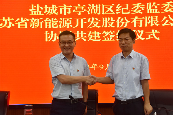 亭湖区纪委监委杨劲松与江苏省新能源公司纪委代表孙志刚签署共建协议。